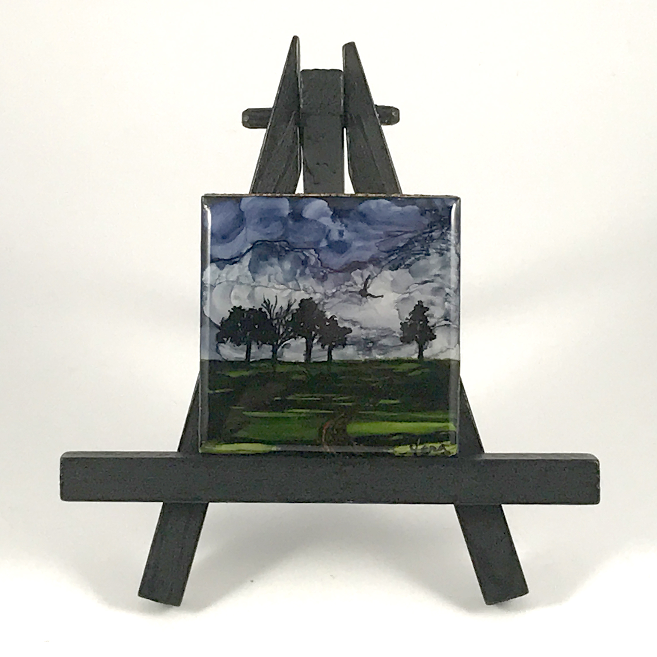 “Storm’s a Brewin” mini art is a gloomy landscape with a stormy sky and a road leading off towards a few trees in the distance. This was hand painted with alcohol inks on a mini 2″x2″ ceramic tile and is displayed on a mini easel, choose black or natural.